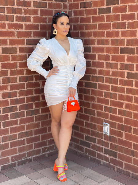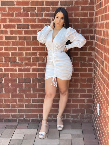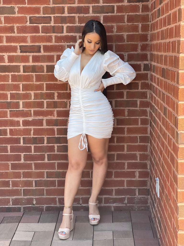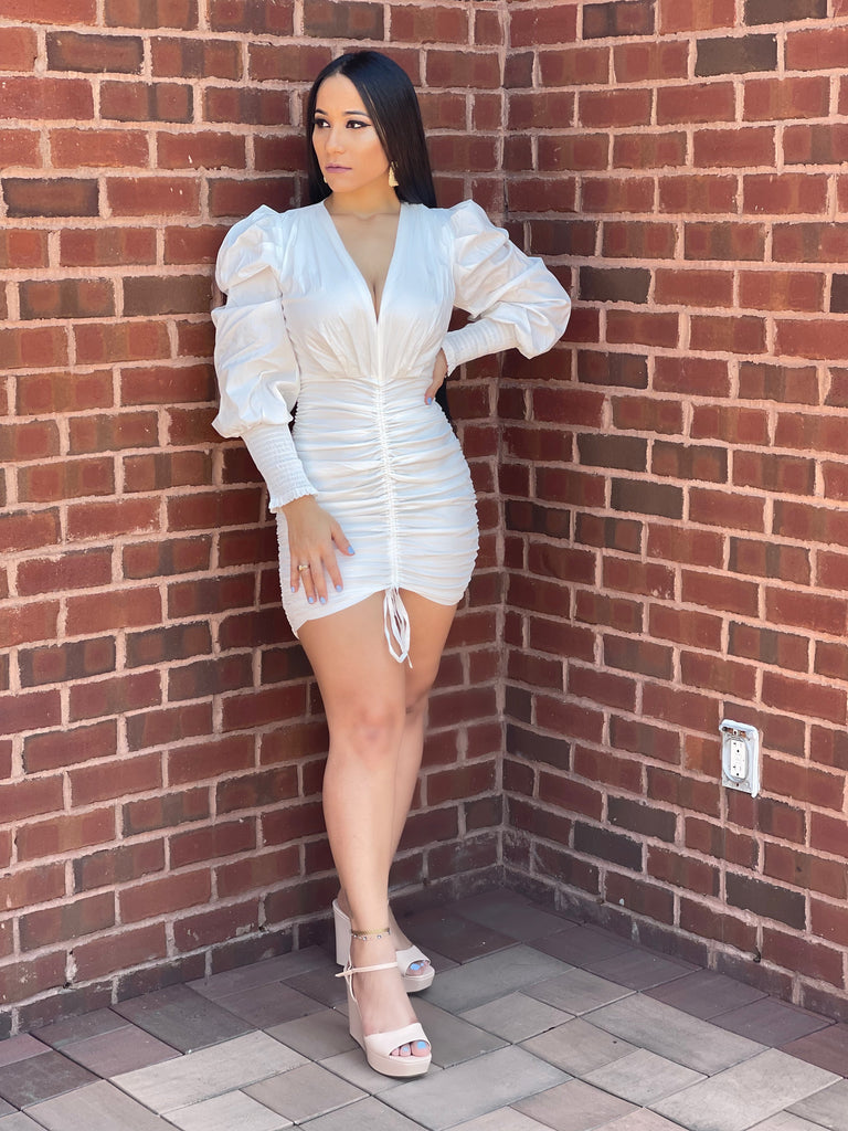 Ruched Deep-v puff sleeve mini dress. 65% cotton 32% nylon 3% spandex. Model is 5’8” and wearing a small.
