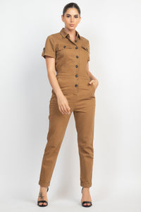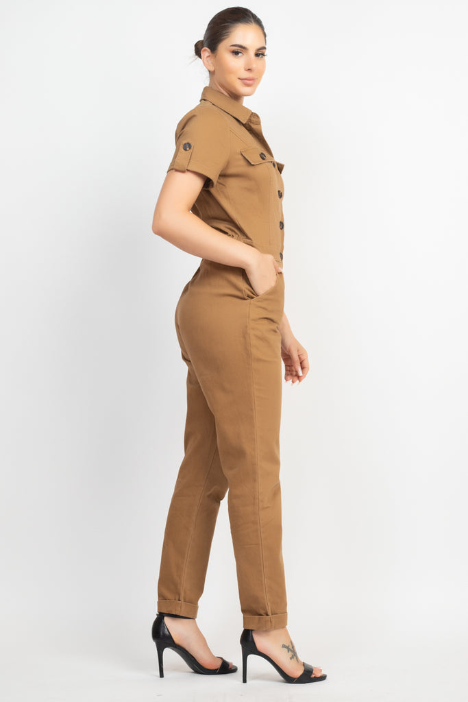 A fashion jumpsuit in a solid color featuring short sleeves with button tabs, collar, side pockets, front button closure, and a full length.