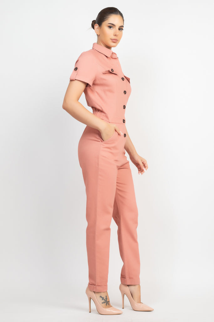 A fashion jumpsuit in a solid color featuring short sleeves with button tabs, collar, side pockets, front button closure, and a full length.